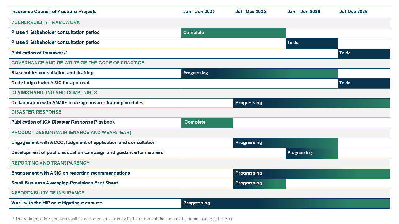 The Insurance Council of Australia continues implementation of its commitments made in the Industry Action Plan and provides bi-annual progress updates via this webpage